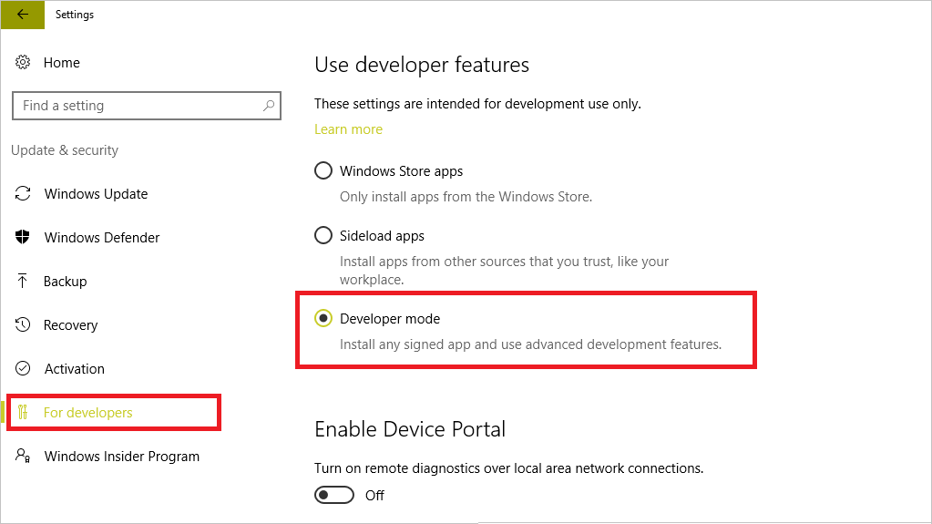 Open the Settings app on your PC (an easy way to do it is to click the Windows button, type "Settings," and click Settings). Then click Update & security followed by For developers, and select Developer mode if it isn't already selected.