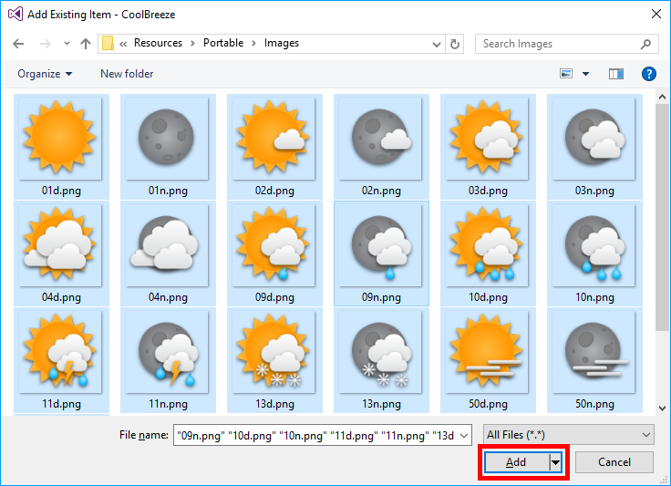 Select all of the files in the zip file's "Resources\Portable\Images" folder, and then click Add.