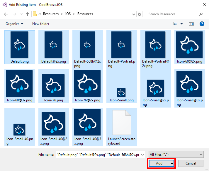 Right-click the project's "Resources" folder and select Add > Existing Item.... Then browse to the "Resources\iOS\Resources" folder in the zip file containing this challenge, select all of the files in the folder, and click Add.