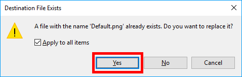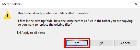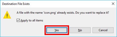 In the "Destination File Exists" dialog, again check Apply to all items and then click Yes. This will update your Android images and assets with appropriately branded assets for your app.