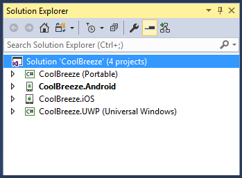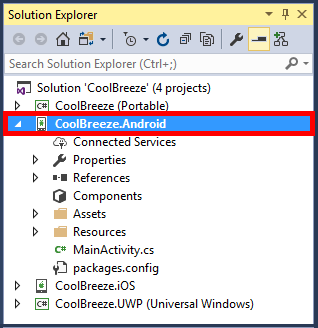 In Solution Explorer, expand the CoolBreeze.Android project to view Android-specific assets and resources.