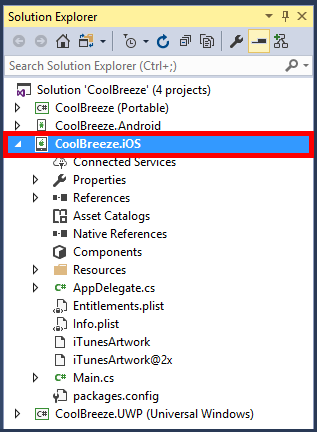 In Solution Explorer, expand the CoolBreeze.iOS project to view iOS-specific assets and resources.
