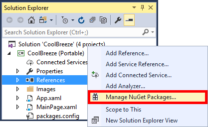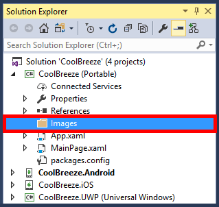 In Solution Explorer, right-click the CoolBreeze (Portable) project and use the Add > New Folder command to add a folder named "Images" to the project. Confirm that the "Images" folder appears in Solution Explorer in the CoolBreeze (Portable) project.