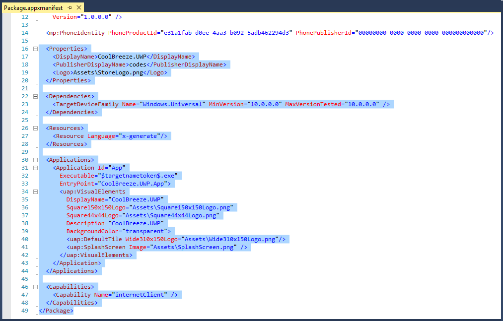 <uap:VisualElements DisplayName="CoolBreeze" Square150x150Logo="Assets\CoolBreeze_150x150.png" Square44x44Logo="Assets\CoolBreeze_44x44.png" Description="CoolBreeze.UWP" BackgroundColor="#003366">