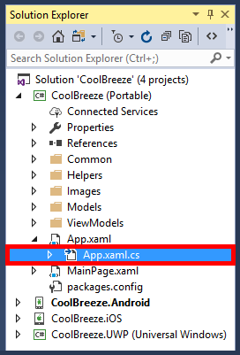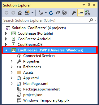 In Solution Explorer, expand the CoolBreeze.UWP (Windows Universal) project to view Windows-specific assets and resources.