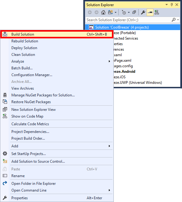 In Solution Explorer, right-click the CoolBreeze solution and select Build Solution to build the solution. Confirm that the solution builds without errors.