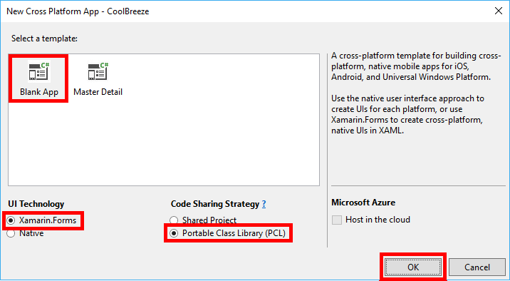 In the "New Cross Platform App" dialog, select the Blank App template. Make sure Xamarin.Forms is selected under "UI Technology" and select Portable Class Library (PCL) as the "Code Sharing Strategy." Then click OK.