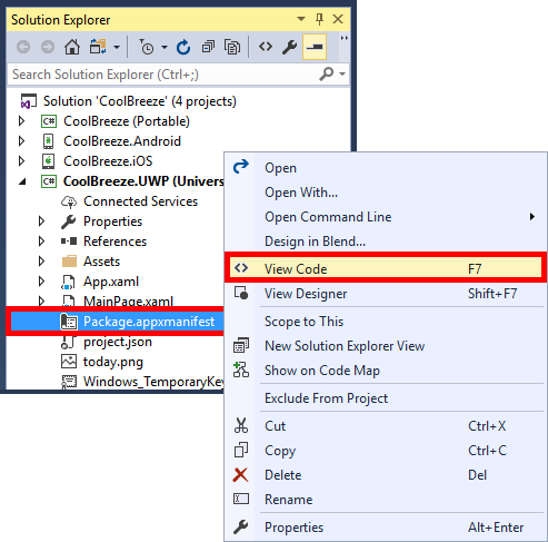 In Solution Explorer, right-click Package.appxmanifest in the UWP project and select View Code.