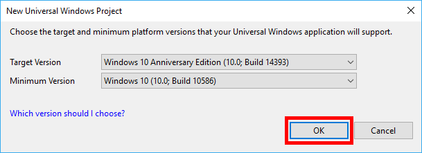When prompted to choose platform requirements for the Universal Windows Platform project, accept the defaults and click OK.