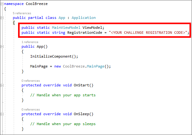Still in App.xaml.cs, replace "<YOUR CHALLENGE REGISTRATION CODE>" with the registration code you received when you registered for the Xamarin Challenge.