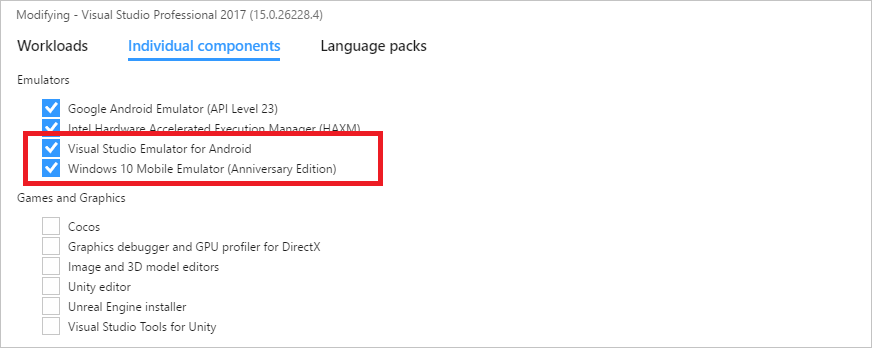 Under "Individual Components" in the Visual Studio installer, make sure Visual Studio Emulator for Android and Windows 10 Mobile Emulator (Anniversary Edition) are checked.