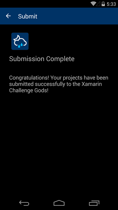 <Label Margin="0,30" FontSize="Medium" Text="Congratulations! Your projects have been submitted successfully to the Xamarin Challenge Gods!" />