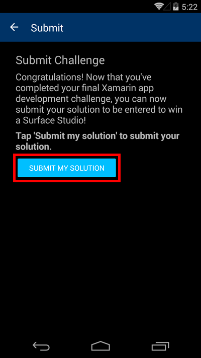 <Label FontSize="Medium" Text="Congratulations! Now that you've completed your final Xamarin app development challenge, you can now submit your solution to be entered to win a Surface Studio!" />