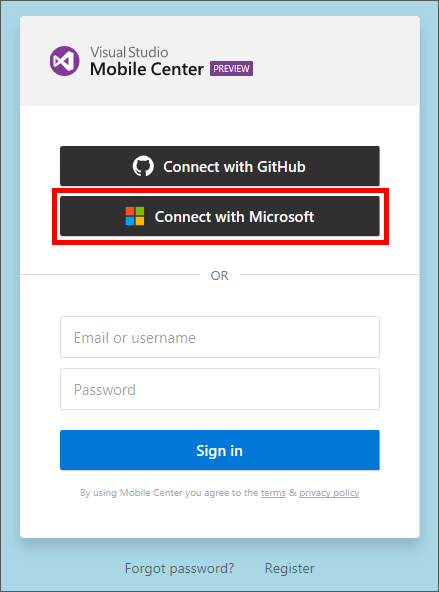 In a browser, navigate to the https://mobile.azure.com/login. Once there, click Connect with Microsoft. If you are prompted to log in, do so using your Microsoft account.