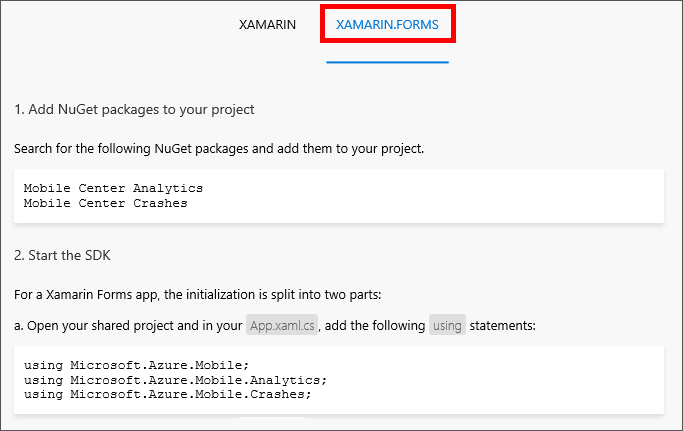 Click Xamarin.Forms for a summary of the steps required to add the Mobile Center SDK to your app. (This is for informational purposes only at the moment. You will make these changes in the next exercise.)