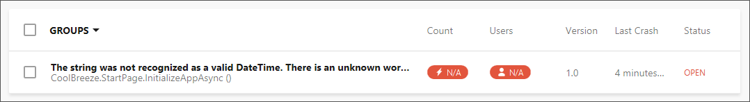 Observe the various charts displaying crash information, as well as the entry at the bottom of the page representing the crash that you generated moments ago. Note that the crash may not appear in the portal for 10 minutes or so. If it's not there, proceed with Exercise 3 of this challenge and return to the crash reports later.