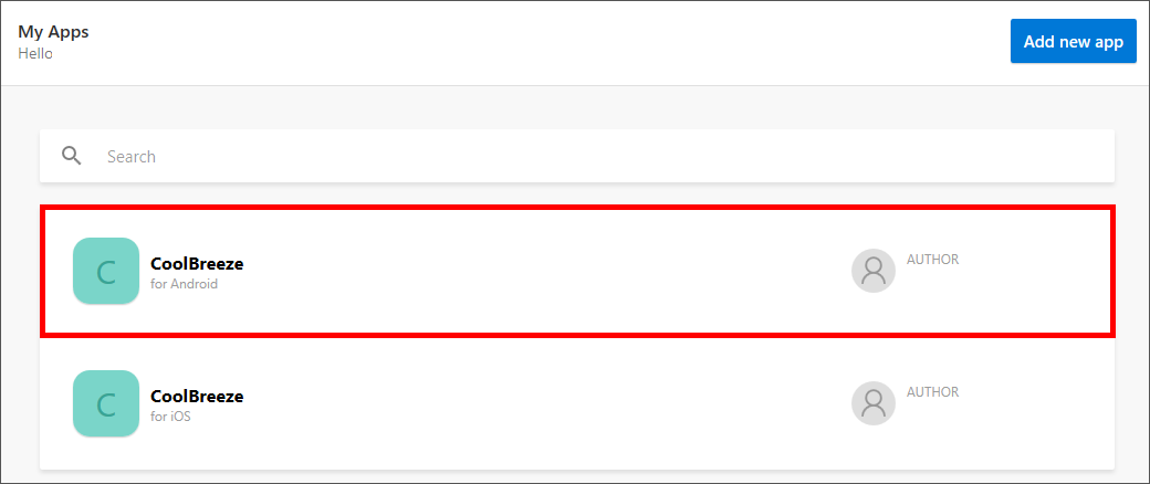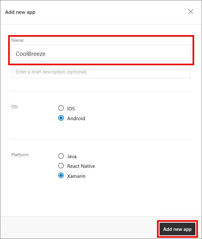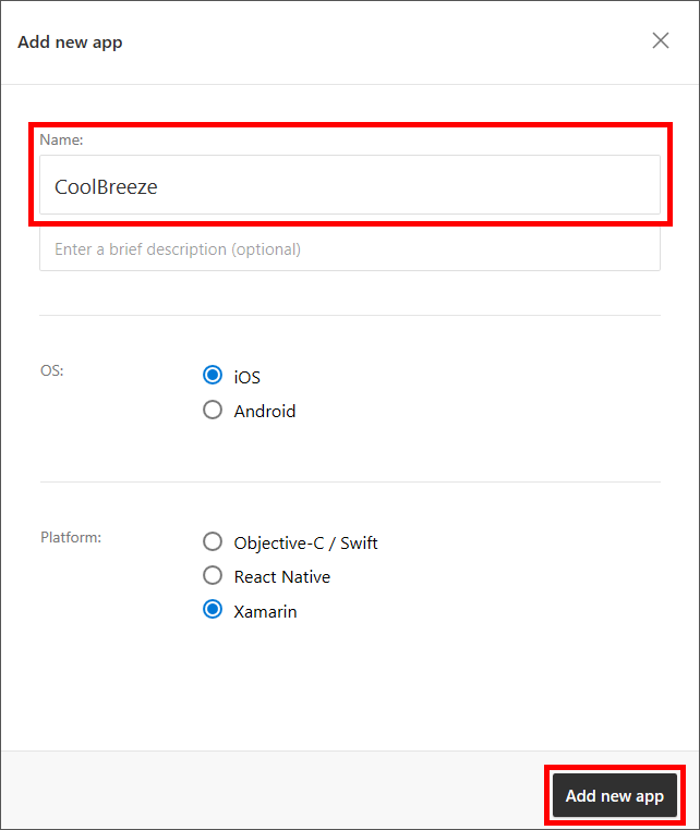 Click Add new app. Enter "CoolBreeze" for the app name, and specify iOS as the OS and Xamarin as the platform. Then click Add new app.
