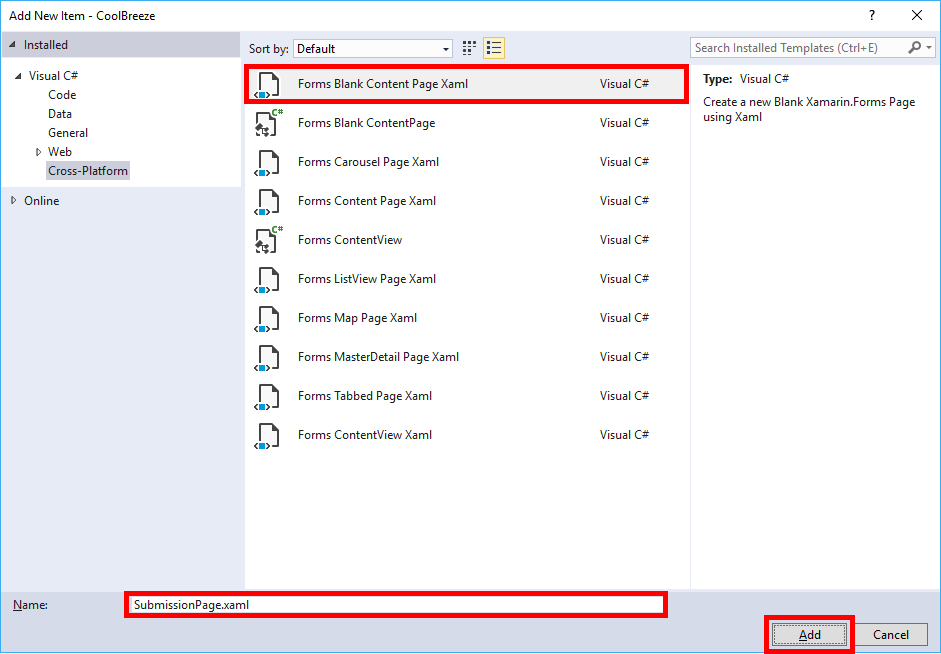 In Solution Explorer, right-click the CoolBreeze (Portable) project and select Add > New Item.... Then select Forms Blank Content Page Xaml, specify "SubmissionPage.xaml" as the name, and click Add.
