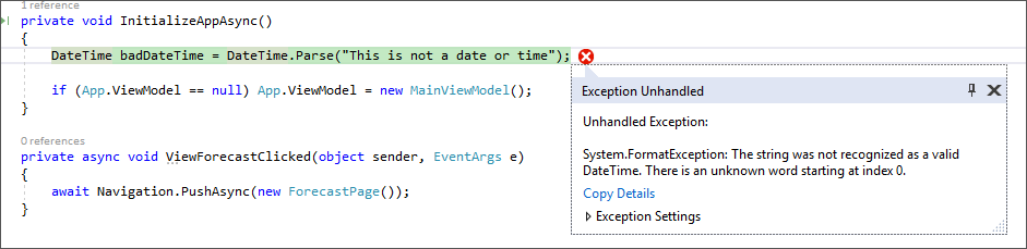 DateTime badDateTime = DateTime.Parse("This is not a date or time");Generating a crash in InitializeAppAsync