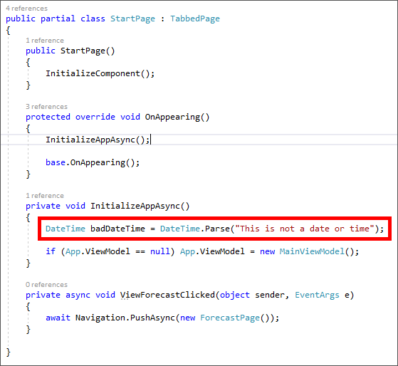 Crash data is initially stored on the local device, and is typically transmitted to Visual Studio Mobile Center the next time the app loads. In Visual Studio, return to StartPage.xaml.cs and remove the line of code that generates the unhandled exception.