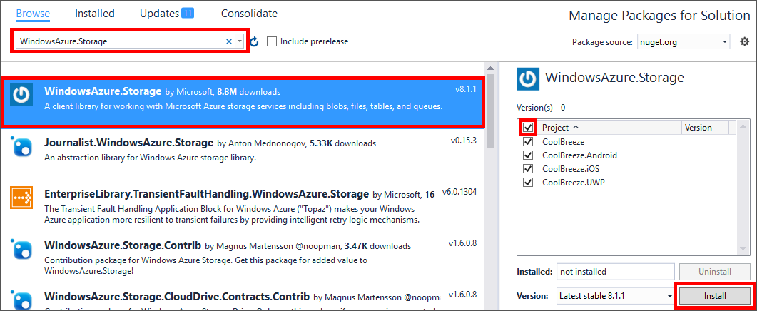 Ensure that "Browse" is selected in the NuGet Package Manager, and type "WindowsAzure.Storage" into the search box. Select the WindowsAzure.Storage package. Then check the Project box to add the package to all of the projects in the solution, and click Install. When prompted to review changes, click OK. If prompted to accept a license, click I Accept.