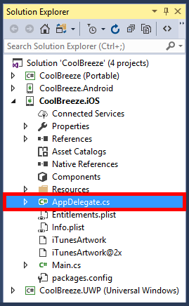 Open the AppDelegate.cs file in the CoolBreeze.iOS project.