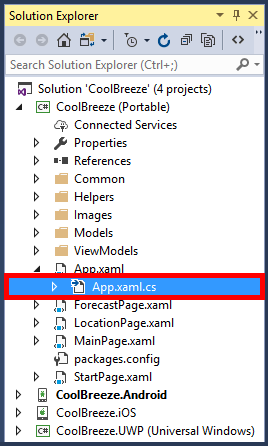 In Solution Explorer, open the App.xaml.cs file in the CoolBreeze (Portable) project.