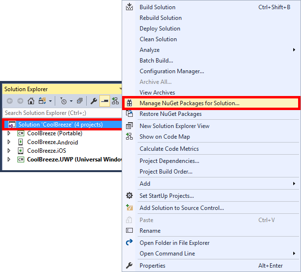 In Solution Explorer, right-click the CoolBreeze solution and select Manage NuGet Packages for Solution….