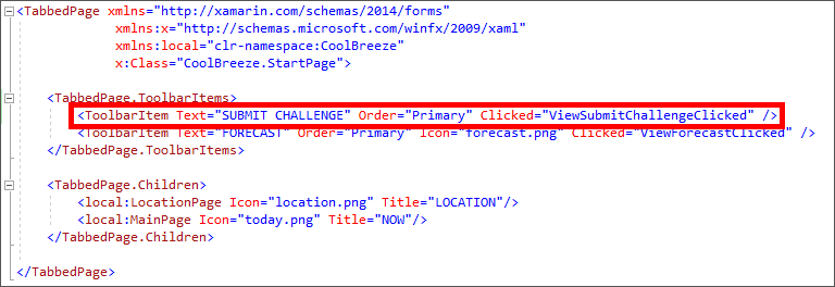 <ToolbarItem Text="SUBMIT CHALLENGE" Order="Primary" Clicked="ViewSubmitChallengeClicked" />Updating StartPage.xaml
