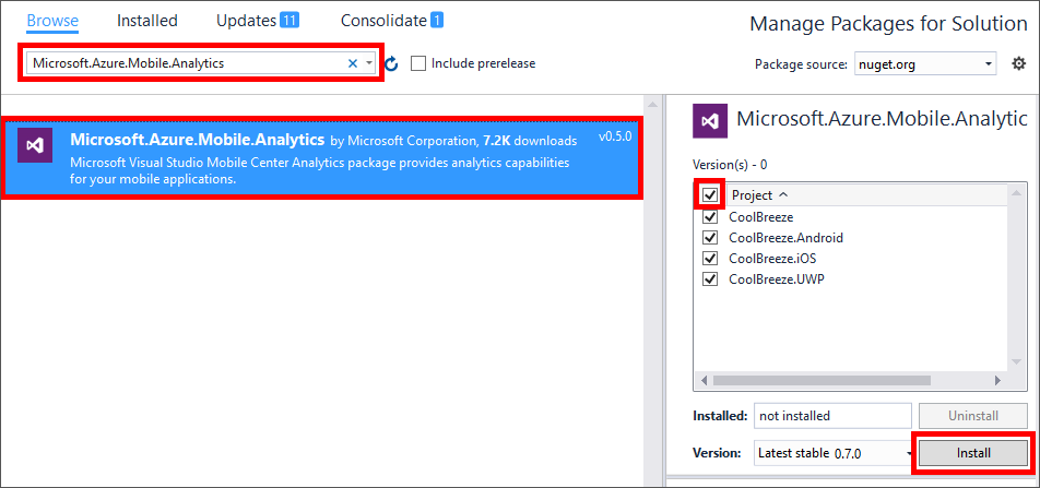 Ensure that "Browse" is selected in the NuGet Package Manager, and type "Microsoft.Azure.Mobile.Analytics" (without quotation marks) into the search box. Select the Microsoft.Azure.Mobile.Analytics package. Then check the Project box to add the package to all of the projects in the solution, and click Install. When prompted to review changes, click OK.