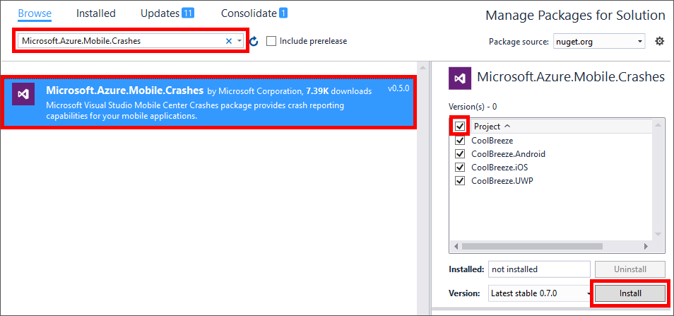 Return to the NuGet Package Manager and once more, ensure that "Browse" is selected. Type "Microsoft.Azure.Mobile.Crashes" into the search box and select the Microsoft.Azure.Mobile.Crashes package. Then check the Project box to add the package to all of the projects in the solution, and click Install. When prompted to review changes, click OK.