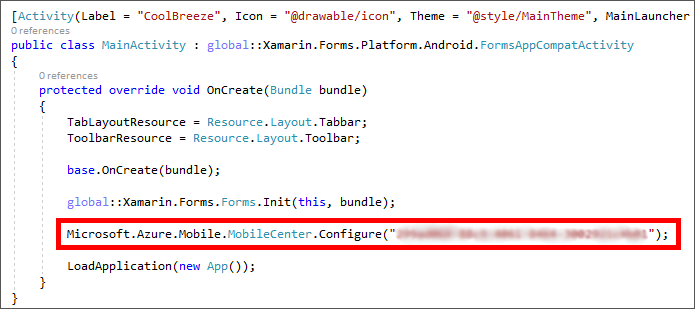 MobileCenter.Start(typeof(Analytics), typeof(Crashes));In Solution Explorer, open the MainActivity.cs file in the CoolBreeze.Android project.